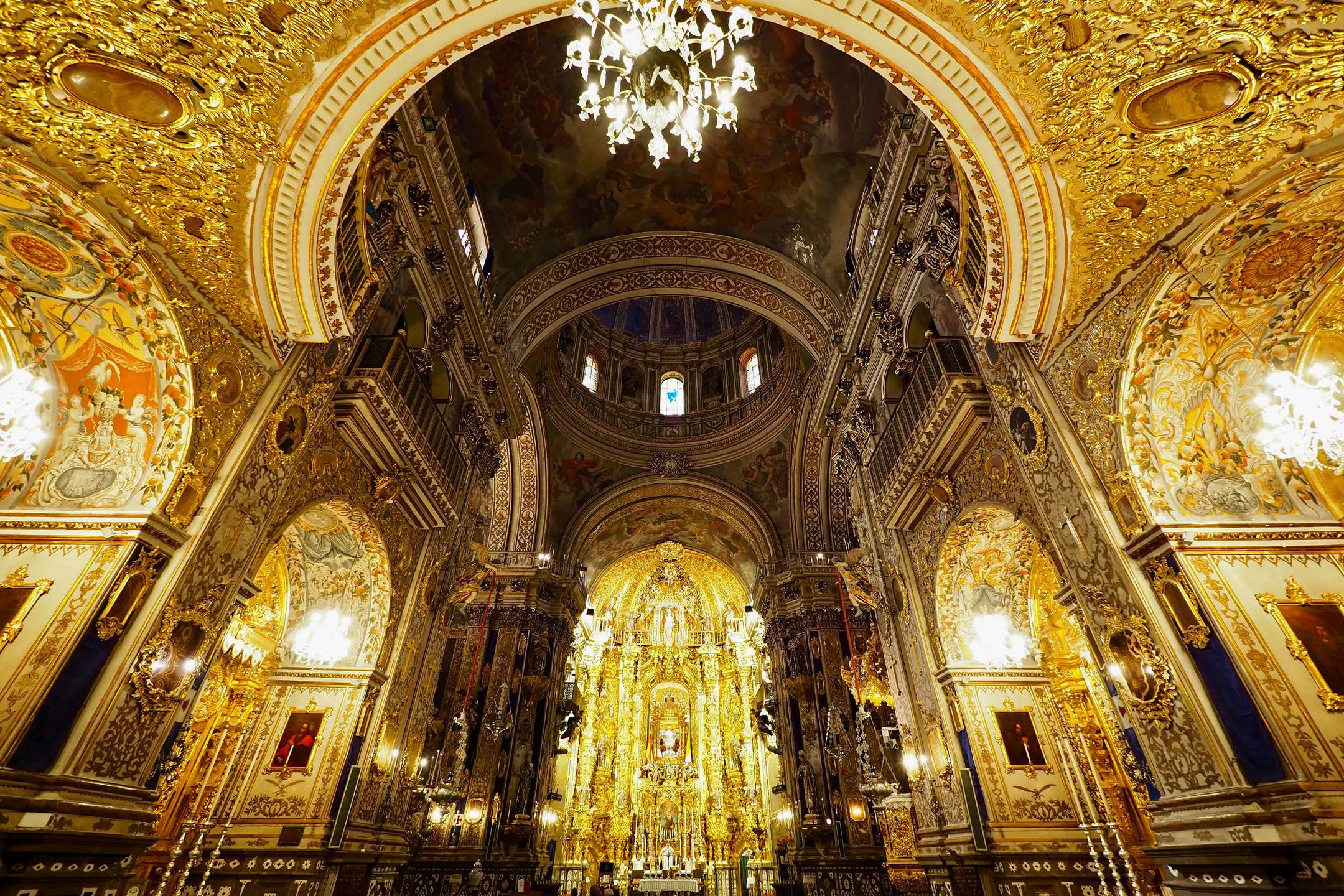 Enter a space that commands attention with its golden hues and baroque shapes rich with ornamentation that encircle the throne on which San Juan de Dios' relics are displayed. In the magnificent urn that keeps his bones safe, birth and death are shown. One hundred and ninety mirrors and reliquaries total, distributed throughout the space, blend beautifully in the Basilica de San Juan de Dios.